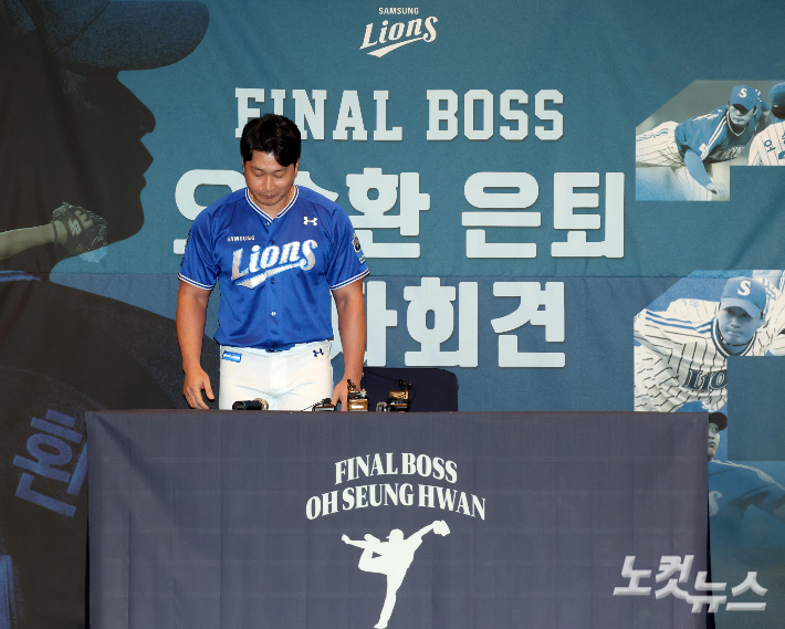 '끝판대장' 오승환 은퇴 "다시 태어나면 마무리는 NO" 한미일 통산 549세이브를 자랑하는 '끝판왕'이 오승환이 7일 오후 인천 연수구 한 호텔에서 은퇴 기자회견 전 고개숙여 인사하고 있다. 한·미·일 통산 549세이브를 거둔 한국 프로야구 최고의 마무리 투수 삼성 오승환(43)은 마운드에서 미동도 없는 표정으로 상대 타자를 압도해 '돌부처'로 불렸다. 인천=황진환 기자