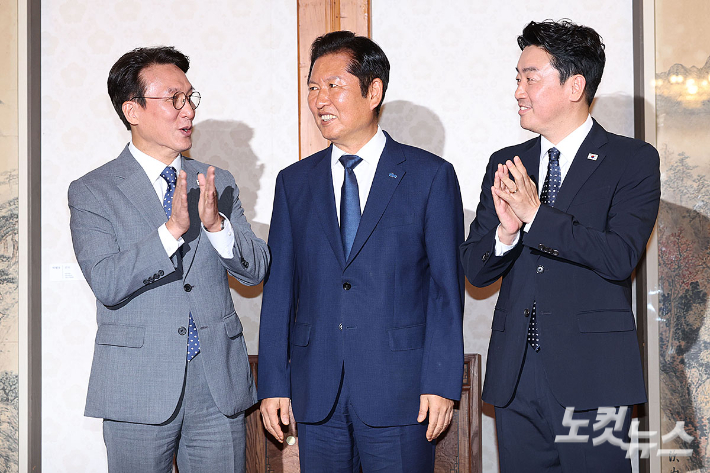 김민석 국무총리와 정청래 더불어민주당 대표, 강훈식 대통령 비서실장 등 당·정·대 관계자들이 10일 오후 서울 종로구 삼청동 총리공관에서 열린 고위 당정협의회에 참석하고 있다.