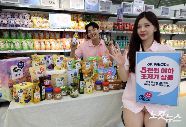 이마트가 32년간 축적한 상품 개발 노하우를 집약해 전 품목을 5천 원 이하로 구성한 새로운 PL ‘5K PRICE(오케이 프라이스)’ 론칭을 앞둔 13일 서울 용산구 이마트 용산점에서 모델들이 ‘오케이 프라이스’를 소개하고 있다. 880원부터 4980원으로 모두 5천원 이하 상품으로 구성된 ‘5K PRICE’ 는 작년 7월 이마트와 에브리데이 합병 이후 처음 선보이는 통합 PL로, 전국 이마트와 에브리데이 370여개 매장에서 동시에 판매된다.