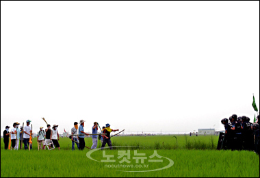 팽성읍 주민과 시민사회단체, 대학생 1만여 명이 참가한 이날 집회에 이어 ''인간띠 잇기'' 행사를 위해 인근 K-6(캠프 험프리) 미군기지로 향하던 시위대와 이를 저지하는 경찰이 논둑에서 대치하고 있다. (평택=오대일기자/노컷뉴스)