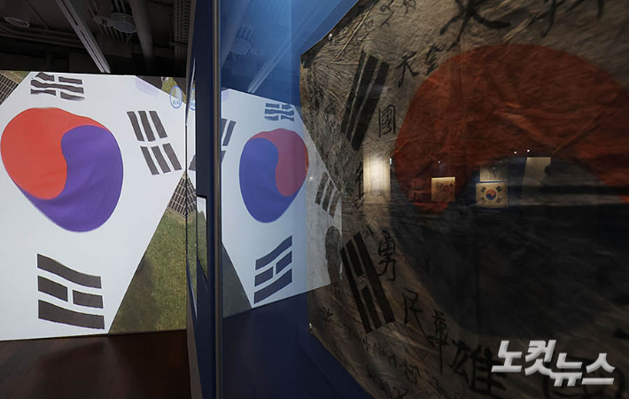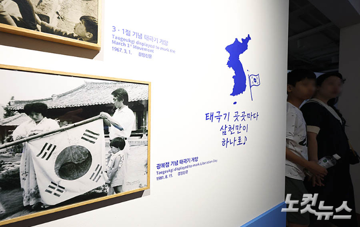 제80주년 광복절을 하루 앞둔 14일 서울 종로구 대한민국역사박물관에서 시민들이 '광복 80주년 기념 특별전-태극기 함께 해온 나날들'을 관람하고 있다.