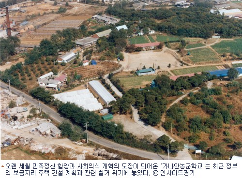 최근 정부의 보금자리 주택 부지 발표와 더불어 유서 깊은 이곳이 철거 위기에 처했다. 이와 관련해 전통학습 요람인 가나안농군학교의 역사적 의의를 살피고, 향후 존립에 관련한 사안을 다루어 본다.