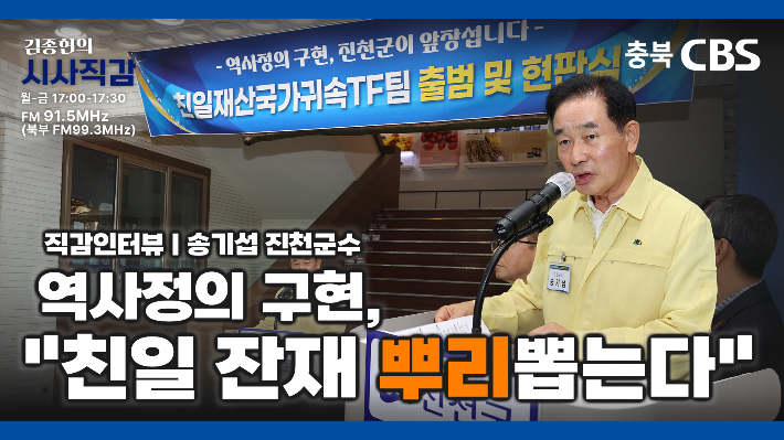 ◇ 김종현> 오늘 <시사직감> 첫 번째 <직감인터뷰> 시작하겠습니다. 오늘 첫 인터뷰에서는 송기섭 진천군수 만나봅니다. 송기섭 진천군수는 최근 광복 80주년을 맞아 친일 잔재 청산에 앞장서겠다고 공언한 바 있죠. 그리고 바로 전담팀을 꾸려서 친일재산을 찾아 국가에 귀속시키기 위한 작업에 돌입했습니다. 큰 이슈가 되고 있는데요, 송기섭 군수께 직접 들어보고요. 이와 함께 아시아태평양 경제협력체에 소개된 진천군의 의료 돌봄 통합 지원 사업과 내년 충북도지사 선거에 대한 생각도 들어보겠습니다. 송기섭 진천군수 전화 연결돼 있습니다. 안녕하십니까, 군수님?