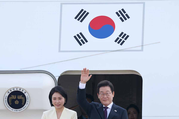 이재명 대통령과 부인 김혜경 여사가 23일 한일·한미 정상회담을 위해 경기도 성남 서울공항을 통해 출국하고 있다.