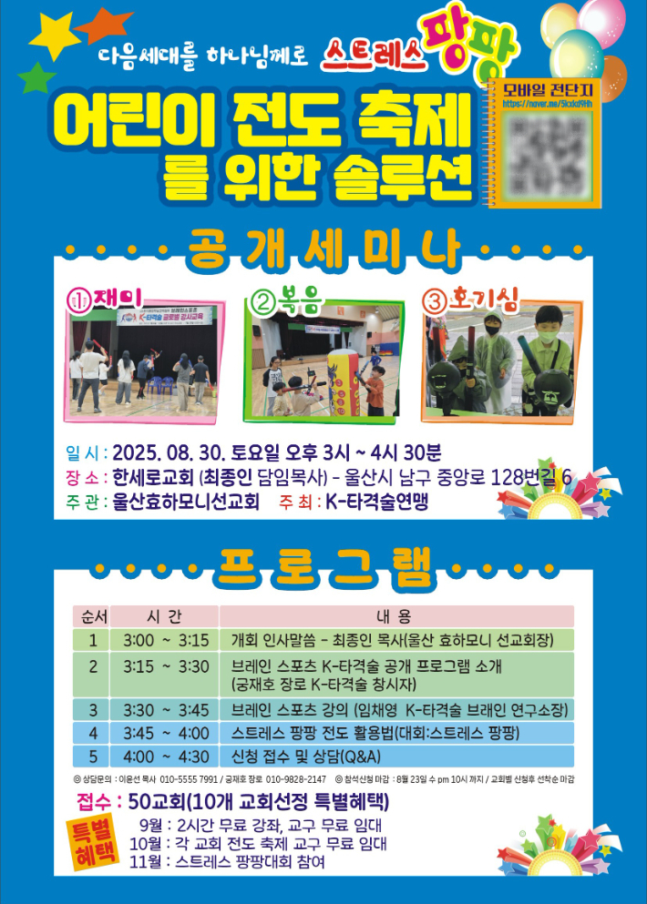 이번 세미나는 K-타격술연맹이 주최하며, 지역 교회학교 현장에서 활용할 수 있는 실제적 전도 방안을 공유할 예정이다.