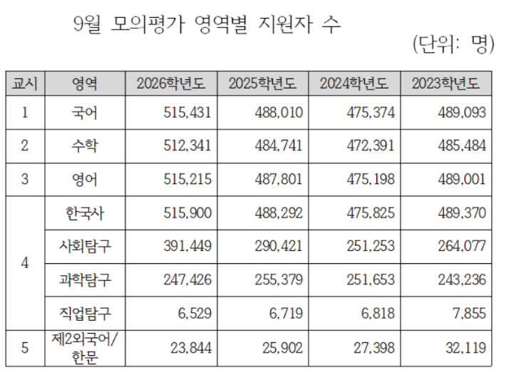 이어 "9월 모의평가에서 사회탐구 지원자는 39만1천여명(61.3%), 과학탐구 지원자는 24만7천여명(38.7%)으로 사회탐구 지원자 비율이 2011학년도 62.7% 이후 15년 만에 가장 높다"고 설명했다.