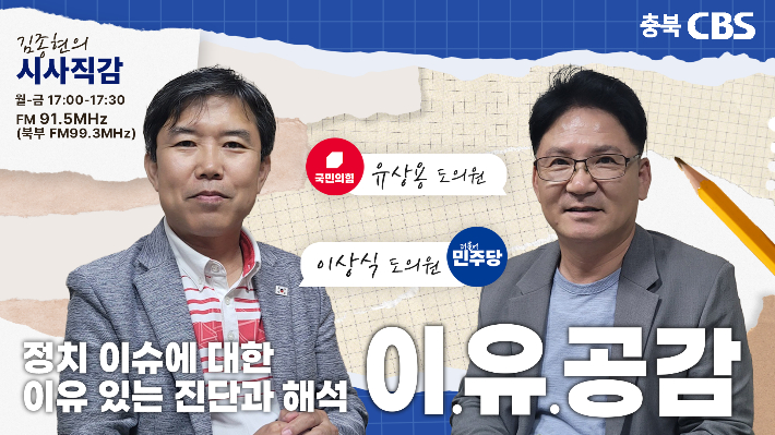 ◇ 김종현> <시사직감> 오늘은 <이유공감> 코너로 진행합니다. 오늘로 여덟 번째 시간인데요. 더불어민주당 이상식 충북도의원, 국민의 힘 유상용 충북도의원 '이','유', 두 정치인과 함께 이슈에 대한 이유 있는 진단과 해석으로 청취자들과 공감해 가는 토크 <이유공감> 시간입니다. 오늘 프로그램은 유튜브 충북CBS를 통해서도 실시간 시청하실 수 있습니다. 오늘도 최근 정치 이슈 비롯해서 새 정부의 외교, 또 지역 현안까지 시간이 허락하는 한 두루 이야기 나눠보도록 하겠습니다. 이상식, 유상용 도의원 스튜디오에 나와 계십니다. 두 분 안녕하십니까?