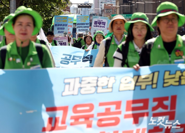 공공운수노조 조합원들이 10일 오후 서울 용산역 앞에서 ‘공무직 노동자 100명이 이재명 100일에 요구한다! 공무직 노동자 행진’ 기자회견 후 대통령실을 향해 행진하고 있다.