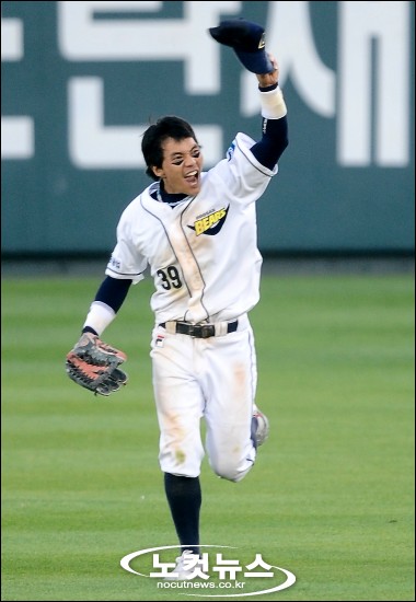 [BestNocut_R]10일 오후 서울 잠실야구장에서 벌어진 프로야구 플레이오프 3차전 두산 베어스와 SK 와이번스의 경기에서 9회초 1사 주자 1,2루 상황에서 SK 정상호의 타구를 두산 이종욱이 다이빙 캐치로 아슬아슬하게 아웃 시키고 2루 주자까지 송구 아웃되자 덕아웃으로 돌아오며 환호하고 있다.