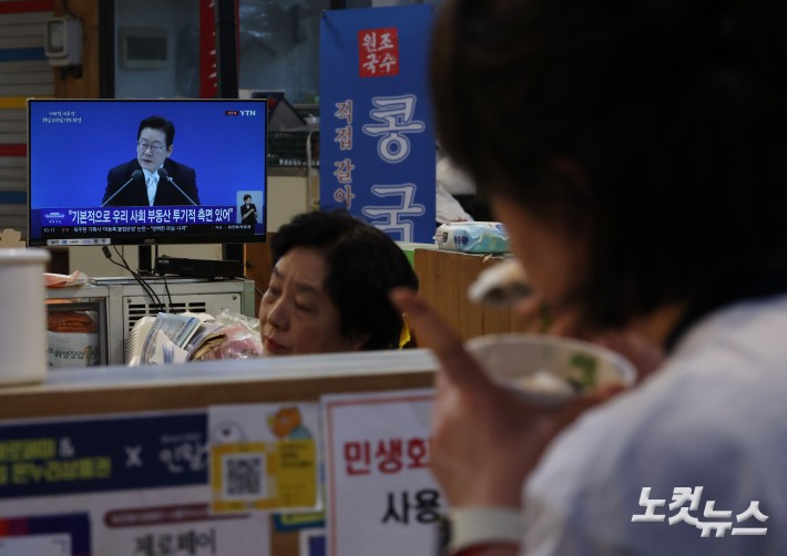 11일 오전 서울 서대문구 인왕시장에서 한 시민이 식사를 하면서 '이재명 대통령 취임100일 기자회견' 을 시청하고 있다.