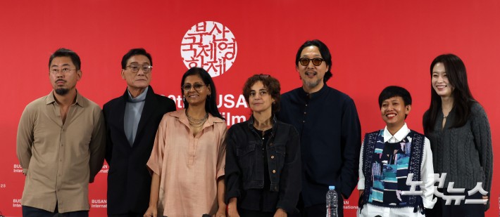 나홍진 심사위원장(왼쪽부터), 배우 양조휘, 난디타 다스 감독, 마르지예 메쉬키니 감독, 코코나다 감독, 율리아 에비나 바하라 프로듀서, 배우 한효주가 18일 오전 부산 해운대구 영화의전당에서 열린 ‘제30회 부산국제영화제(BIFF)’ 경쟁 심사위원 기자회견에 참석해 포토타임을 갖고 있다.