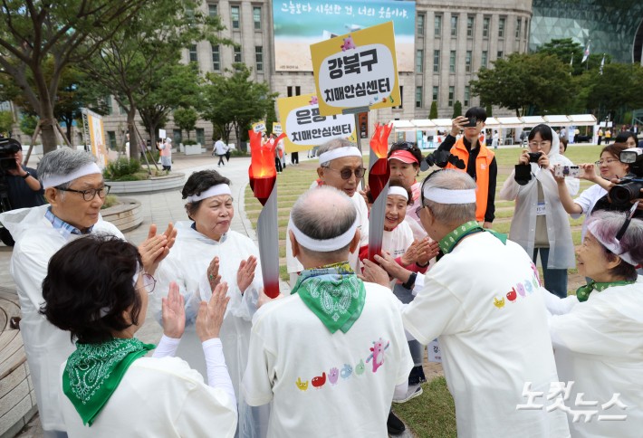 19일 오전 서울광장에서 열린 '제18회 서울시 치매극복의 날 기념행사' 참석자들이 치매동행 이벤트 성화봉송 릴레이를 진행하고 있다.