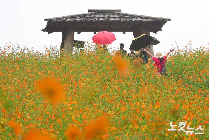 가을비가 내린 19일 서울 송파구 올림픽공원 들꽃마루를 찾은 시민들이 기념 촬영을 하며 즐거운 시간을 보내고 있다.