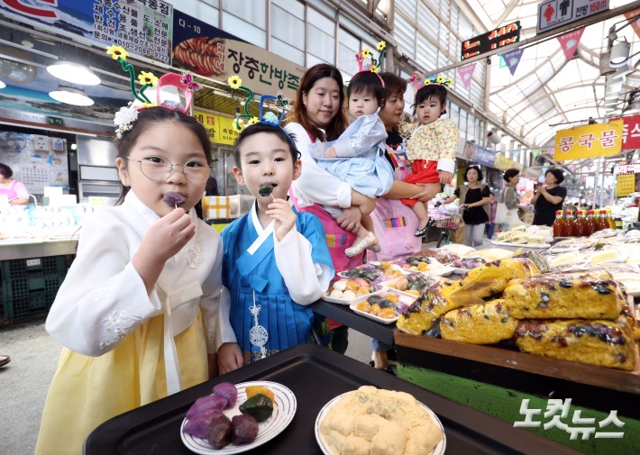 추석연휴를 이틀 앞둔 1일 오전 서울 양천구 목사랑시장을 찾은 키드윈아트 어린이집 원아들이 송편을 먹고 있다.