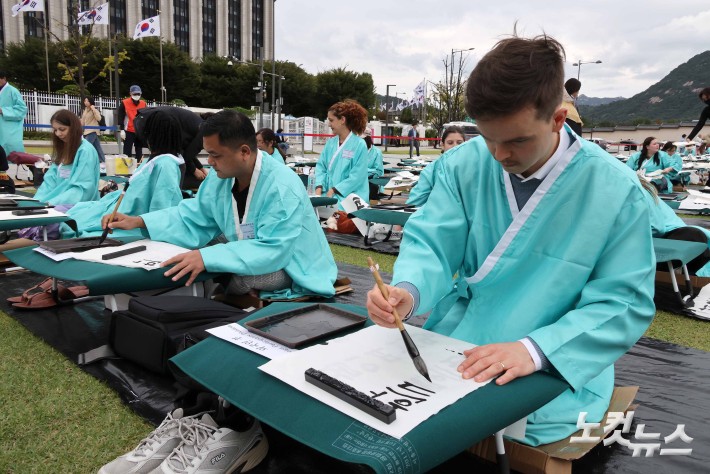 9일 579돌 한글날을 맞아 서울 광화문광장에서 열린 '제16회 광화문광장 휘호대회'에 참가한 외국인들이 한글 서예 실력을 뽐내고 있다.