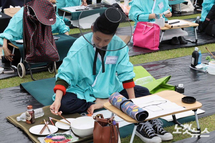 9일 579돌 한글날을 맞아 서울 광화문광장에서 열린 '제16회 광화문광장 휘호대회'에서 갓을 쓴 참가자가 한글 서예 실력을 뽐내고 있다.