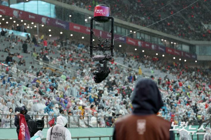10일 서울월드컵경기장에서 열린 축구 국가대표팀 친선경기 대한민국과 브라질의 경기에서 '스파이더캠'이 운용되고 있다.