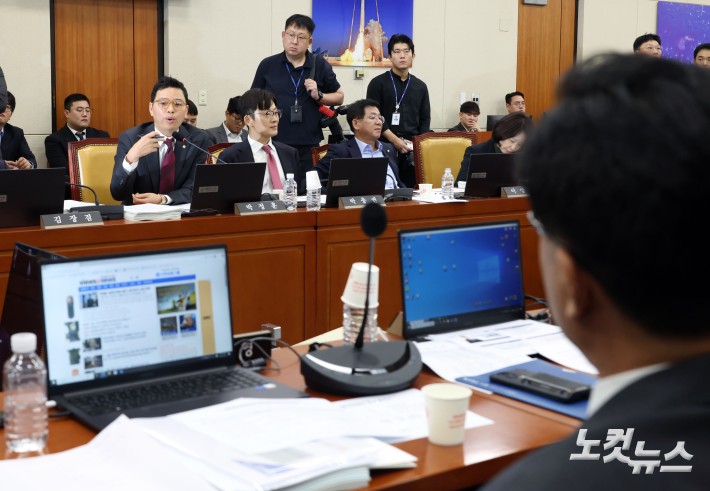 16일 국회 과학기술정보방송통신위원회에서 열린 원자력안전위원회 등에 대한 국정감사에서 국민의힘 박정훈 의원이 욕설 논란과 관련해 더불어민주당김우영 의원과 언쟁을 하고 있다.