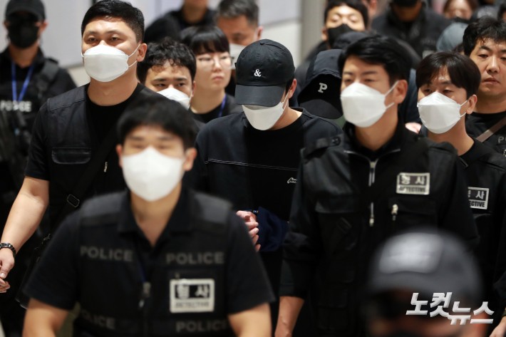캄보디아에 구금돼 있던 한국인 64명이 18일 오전 인천공항을 통해 송환되고 있다. 이들은 보이스피싱 등 국제 범죄 조직에 가담한 혐의를 받고 있다.