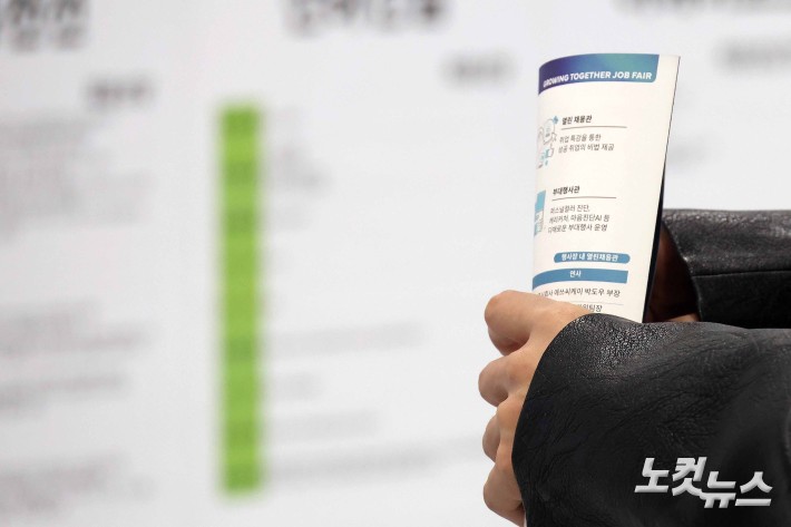 21일 서울 강서구 코엑스 마곡에서 열린 2025 민관합동 상생협력 채용박람회에서 구직자들이 채용공고 게시판을 살펴보고 있다.