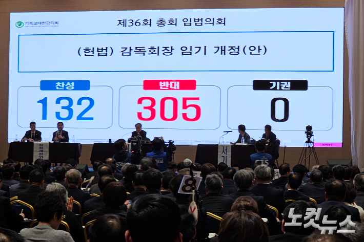 교계 안팎으로 관심을 모았던 감리교 '감독회장 4년 겸임제'는 찬성 132표, 반대 305표로 부결됐다.