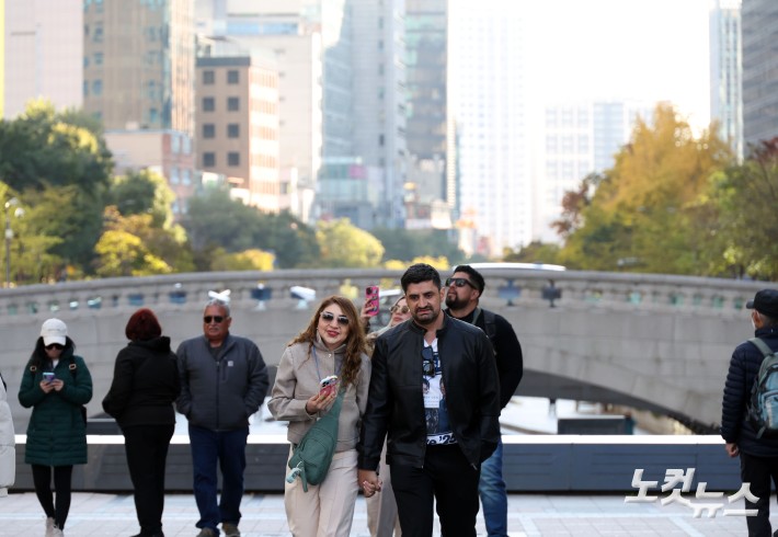 서울 등 내륙 곳곳에 올가을 첫 한파특보가 발효된 3일 오전 서울 청계광장 인근에서 외국인들과 시민들이 두꺼운 옷을 입고 이동하고 있다. 추위는 4일 오전까지 이어진 뒤 점차 누그러져 예년의 11월 가을 날씨를 회복할 전망이다.