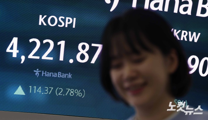 코스피 지수가 연일 사상 최고치를 경신하고 있는 가운데 3일 서울 중구 하나은행 딜링룸 현황판에 코스피, 원/달러 환율 등이 표시돼 있다. 이날 코스피는 전 거래일 대비 114.37포인트(2.78%) 오른 4221.87, 코스닥은 전 거래일 대비 14.13포인트(1.57%)상승한 914.55로 장을 마쳤다.