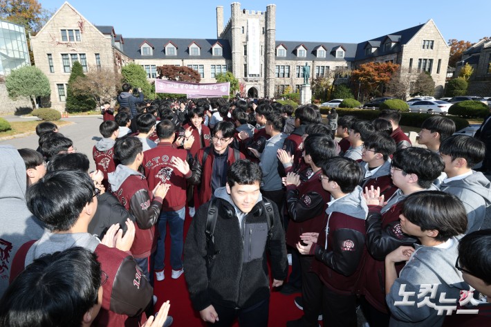 2026학년도 대학수학능력시험을 하루 앞둔 12일 서울 종로구 중앙고등학교에서 수험생들이 후배들의 응원을 받으며 학교를 나서고 있다.