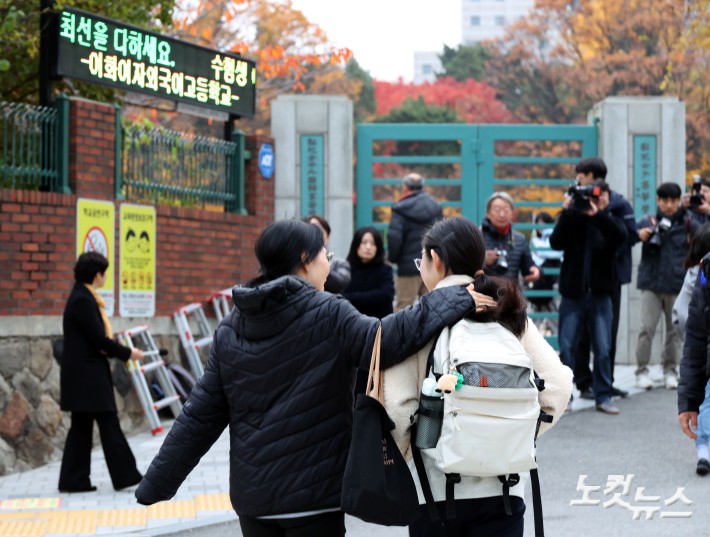 2026학년도 수능일인 13일 오전 서울 중구 이화여자외국어고등학교 교문 앞에서 학부모가 수험생을 격려하고 있다.
