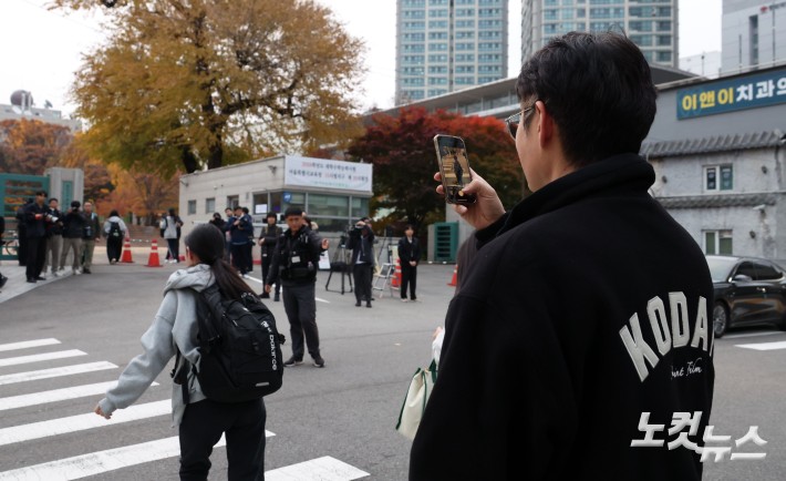 2026학년도 수능일인 13일 오전 서울 중구 이화여자외국어고등학교 교문 앞에서 학부모가 딸의 뒷모습을 카메라에 담고 있다.