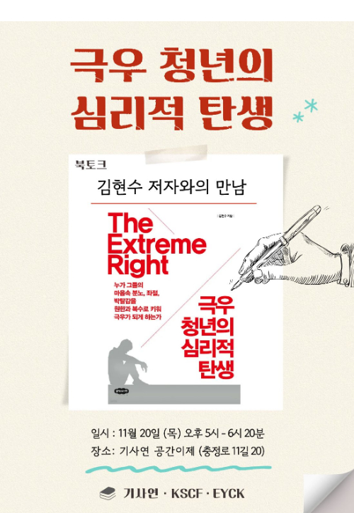 기독교사회문제연구원은 오는 20일 '극우 청년의 심리적 분석'의 저자 김현수 교수(명지병원 정신건강의학과)를 초청해 북토크를 연다. 한국기독학생총연맹(KSCF)과 한국기독청년협의회(EYCK)와 공동으로 주최한다.