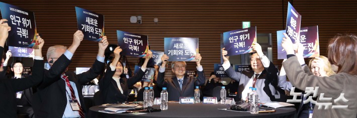 나이영 CBS 사장과 주형환 저출산고령사회위원회 부위원장, 이스란 보건복지부 차관 등 참가자들이 18일 서울 여의도 FKI타워 그랜드볼룸에서 CBS와 보건복지부 주최로 열린 '2025 대한민국 인구포럼 - 새로운 기회와 도전'에서 인구위기 극복 세리머니를 하고 있다.