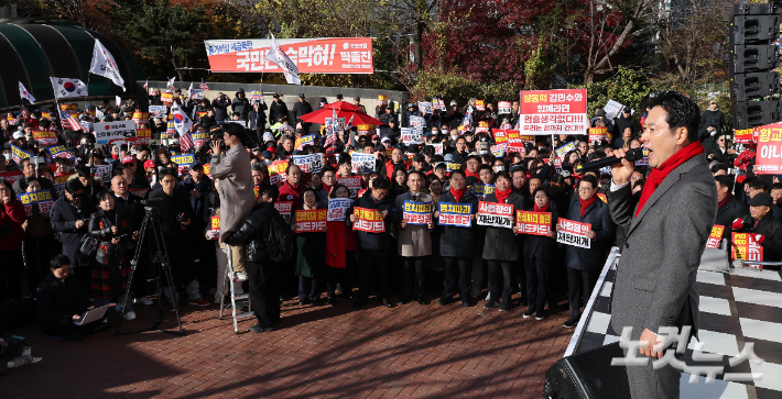 장 대표는 이날 '민생회복 법치수호 국민대회'에서 오는 2일 예정된 추 전 원내대표의 구속 전 피의자 심문(영장실질심사)를 두고 "저는 기각을 확신하고 있다. 특검의 영장은 읽기도 역겨운 삼류소설"이라며 "내일 영장 기각이 대반격의 신호탄이 될 것"이라고 말했다.