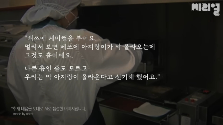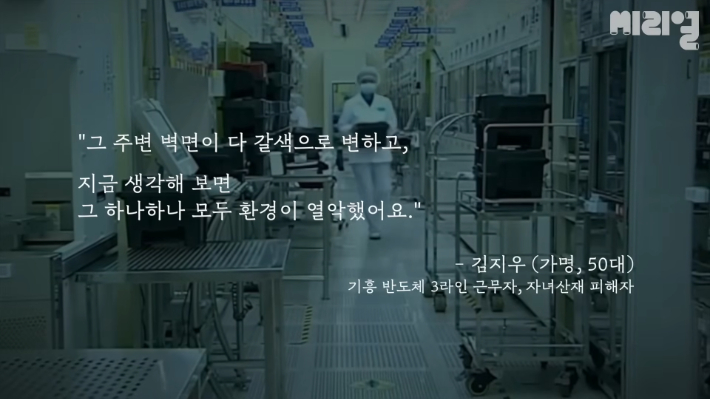 "베쓰에 케미컬을 부어요. 멀리서 보면 베쓰에 아지랑이가 막 올라오는데 그것도 흄이에요. 나쁜 흄인 줄도 모르고 우리는 막 아지랑이 올라온다고 신기해했어요. 그 주변 벽면이 다 갈색으로 변하고, 지금 생각해 보면 그 하나하나 모두 환경이 열악했어요." - 김지우(가명), 기흥 반도체 3라인 근무자