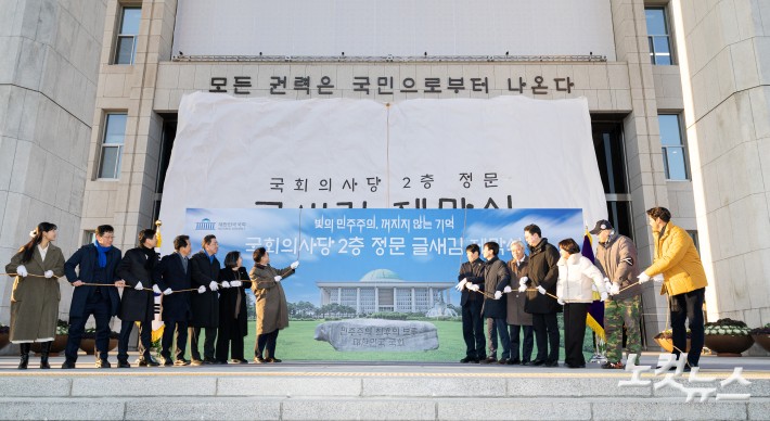 우원식 국회의장이 3일 서울 여의도 국회 본관 정현관에서 열린 글새김 제막식에서 김병기 더불어민주당 원내대표를 비롯한 주요 참석자들과 함께 제막하고 있다.