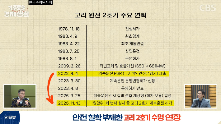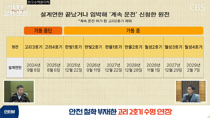 ◆ 홍종호> 그래요. 제가 시작할 때도 말씀드렸지만 부산 고리 원전 2호기 수명 연장이 확정됐거든요. 그래서 2033년까지 운전하게 됐는데요. 아무래도 원전의 안전 문제에 관심이 많으시니까 어떤 과정을 거쳐서 다시 수명 연장 허가가 났는지 배경 설명 부탁드립니다.