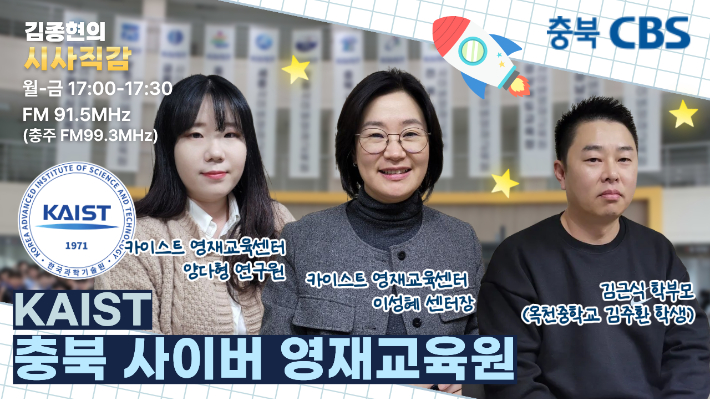 ◇ 김종현> 오늘 <시사직감>은 충청북도교육청이 미래 사회에 필요한 창의융합형 글로벌 인재양성을 위해 운영하는 교육기관과 프로그램을 소개하는 시간입니다. 오늘은 충북의 글로벌 인재양성 프로그램의 한 축을 맡고 있는 카이스트 운영 충북사이버영재교육원에 대해서 이야기 나눠볼까 합니다. 오늘 함께해 주실 분은 모두 세 분입니다. 카이스트 영재교육센터 이성혜 센터장, 양다형 연구원 그리고 카이스트 충북사이버영재교육원 중1 수학, 과학 합반을 수료한 옥천중학교 1학년 김주환 학생의 아버지이십니다, 김근식 학부모, 이렇게 세 분 스튜디오에 나오셨습니다. 오늘 방송은 유튜브 충북CBS를 통해서도 실시간 시청하실 수 있습니다. 세 분 모두 안녕하십니까?