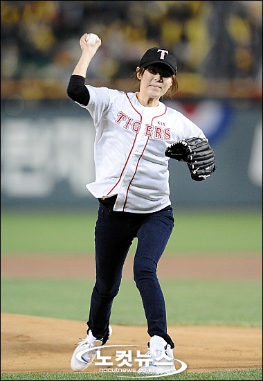 22일 서울 잠실야구장에서 벌어지는 KIA 타이거즈와 SK 와이번스의 한국시리즈 5차전에 배우 최강희가 시구를 하고 있다.