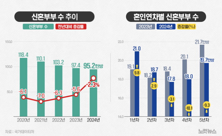 국가데이터처가 12일 발표한 '행정자료를 활용한 2024년 신혼부부통계 결과'에 따르면 95만 2천 쌍으로 전년보다 2.3%(2만 2천 쌍) 감소했다.