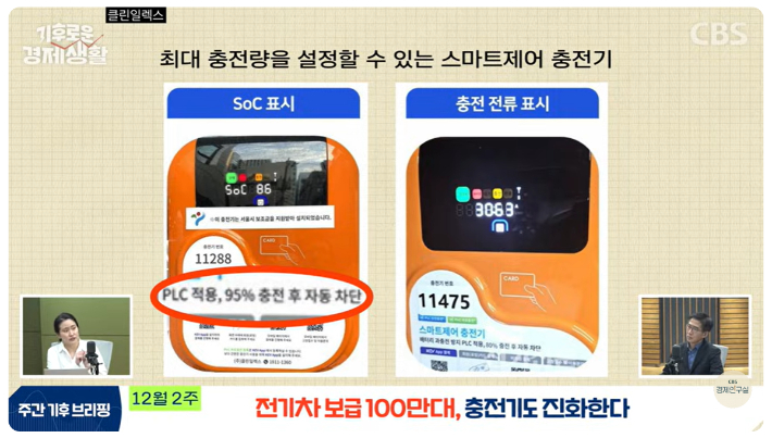 ◇ 최서윤> 맞습니다. 생각보다 빨라질 수 있는데, 근데 상상이 일상으로 들어오려면 갈 길이 멉니다. 속도 더 내야 돼요. 제가 서두에 지금까지 보급된 충전기 대수 47만 기 정도라고 말씀드렸잖아요. 이 중에 제가 말씀드린 스마트 기능 실현할 수 있는 충전기는 5만 기가 조금 안 된다고 해요. 기후부가 이름을 '스마트 완속 충전기'란 이름을 붙였는데, 이 기능들을 수행하려면 PLC(Power Line Communication) 모뎀이 설치가 돼야 한대요. 그러니까 전력선을 통신 매체로 활용해 송수신하는 기능을 갖춘 충전기가 필요한데, 이 사업 구상을 2023년에 하고 그해 말부터 보급하다 보니까 보급 속도가 빠르진 않은 거예요. 그래서 앞으로 새로 보급하는 충전기는 스마트 완속 충전기로 설치를 하고, 또 기존 충전기 중에서 노후화됐거나 안전성 보완할 필요가 있는 건 교체해 나간다는 계획입니다. 그래서 내년 예산 중에 지금 전기차 충전기 관련된 예산 보면요, 인프라 구축 예산이 5507억 5천만 원이 편성됐더라고요. 이 중에 한 5분의 1, 1325억이 바로 스마트 완속 충전기 관련 예산입니다. 민간에서 신규 보급할 때 주는 보조금 1100억, 교체할 때 주는 보조금 225억, 이렇게 해서 내년에 5만 기의 스마트 완속 충전기를 신규 보급하고, 2만 기의 노후 충전기를 교체하는 게 정부 목표라고 합니다. 그리고 전기차 충전 속도에도 관심 많으시더라고요. 지금 충전기 47만 기 중에 급속은 5만 2천 기밖에 안 돼요. 급속충전기가 훨씬 비싸서 전부 급속으로만 깔 수 없기 때문에 85%는 완속충전기인 상황이거든요. 이 급속충전기도 조금 더 확충하려고 한다고 해요. 공공 부문 구축 비용 990억, 그다음에 민간 보조금 2842억 5천만 원 예산 편성됐습니다.