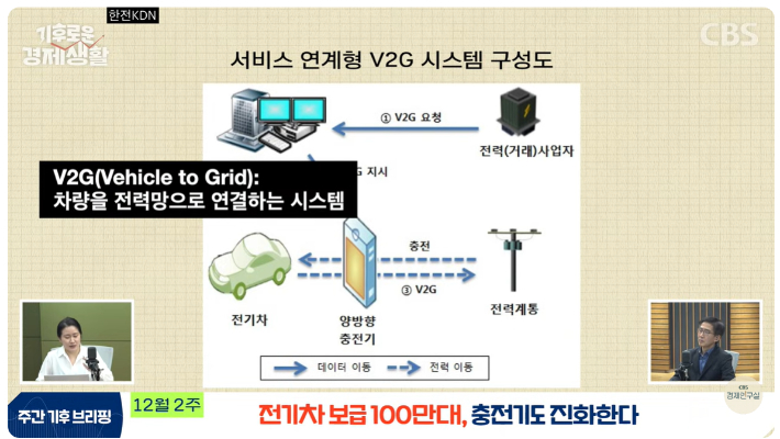 ◇ 최서윤> 그러니까 전기차가 배터리와 전력망 간의 연결, V2G라는 서비스를 통해서 전력 시장에 참여해서 전기를 생산하는 발전소 역할을 할 수도 있는 거고, 그다음에 남는 전력 같은 거 저장해 두는 배터리 역할, 에너지저장장치, ESS 같은 역할을 할 수 있게 되는 겁니다. V2G가요, 제주도가 지금 분산 에너지 특구로 최근에 지정되면서 제주에서 진짜 본격적인 실험을 준비하게 됩니다. 그래서 다양한 실증 사업 거쳐서 언젠가는 상용화될 미래를 준비하는 거예요. 아직 해외 다른 나라도 상용화된 사례는 없거든요. 지난주 금요일 12월 5일에 기후부랑 산학연 전문가가 참여하는 'V2G 상용화 전략 추진 협의체' 사업도 착수했어요. 그러니까 기술뿐만 아니라 관련해서 필요한 법·제도·시장 전 분야를 아울러서 V2G 상용화를 준비하겠다는 겁니다. 듣기로 카이스트에는요, 아예 도로에 선로를 깔아서 달리는 중에 충전하게 되는 전기 도로도 설치돼 있다고 하더라고요. 그래서 나중에는 달리는 전기차가 태양광 전력 같은 걸 생산해서 자체 소비도 하고 남는 전력은 전력 공급도 하는 미래가 가능할지 기대됩니다.