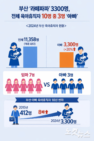부산에서 아빠의 육아휴직이 빠르게 늘고 있다. 지난해 부산의 아빠 육아휴직자는 3300명으로 역대 최다를 기록했고, 전체 육아휴직자 가운데 아빠 비중은 30%에 육박했다. 일과 가정의 균형을 중시하는 인식 확산과 제도 개선이 맞물린 결과로 풀이된다.