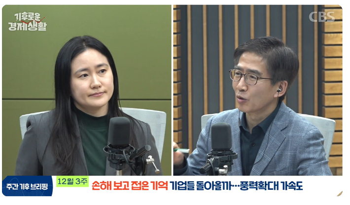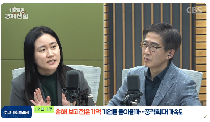 ◇ 최서윤> 네, 해상풍력 설비 용량은요. 지금 육상풍력보다 훨씬 더 적어요. 0.35GW 정도 됩니다. 근데 기후로운 경제생활에서도 다룬 바가 있어요. 바람소득이라고 해서 주민이 직접 발전 사업에 참여하면 주고 이익 공유형 모델로 개발해서 주민 수용성 문제 개선할 수 있는 제도 설계해 주고 하면 더 속도 붙을 거라고 보는 게 지금 시각이 있습니다. 그런데 '해상풍력도 범정부 해상풍력 보급 가속 TF' 똑같이 결성이 됐어요. 그래서 12월 10일에 해상풍력 인프라 확충 및 보급 계획이라는 걸 발표했습니다. 정부가 지금 목표하는 해상풍력 보급 규모가 2035년까지 25GW 이상이에요.