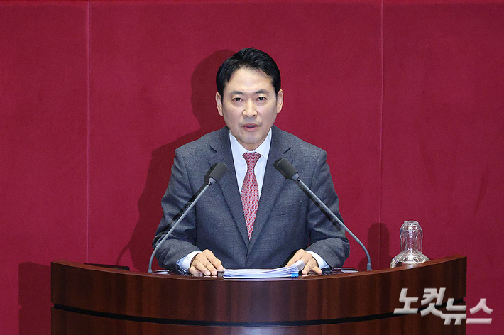 국민의힘 장동혁 대표가 22일 국회 본회의에서 더불어민주당이 발의한 '내란전담재판부 설치법'(내란·외환·반란 범죄 등의 형사절차에 관한 특례법안)에 대한 필리버스터(무제한 토론을 통한 합법적 의사진행 방해) 첫 번째 주자로 발언하고 있다. '내란전담재판부 설치법'은 윤석열 전 대통령의 내란죄 사건 등을 전담해서 다루는 재판부를 설치하는 내용을 담고 있다.