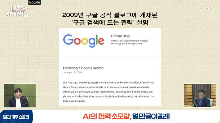◇ 강석찬> 일단 이해를 돕기 위해서 시계를 2009년으로 한번 돌려 보겠습니다. 당시에 미국 하버드대 물리학자가 '야 구글, 너네 검색 한 번에 7g의 이산화탄소가 발생해'라고 주장합니다. 그러니까 구글이 아니라고 하면서 공식 블로그에 해명 자료를 게재하게 되는데요. 우리는 온갖 전처리 작업을 다 포함해도 검색 한 번에 고작 0.3W(와트)씩밖에 들지 않아, 이산화탄소 배출 그렇게 많지 않아, 라고 해명한 겁니다. 그리고 그 말을 믿은 한 연구자가 그럼 AI 검색에는 대략 3W 정도 필요하니까 AI 검색하면 일반 검색보다 한 10배 정도 더 많이 들겠네, 라는 보고서를 내게 된 거죠.