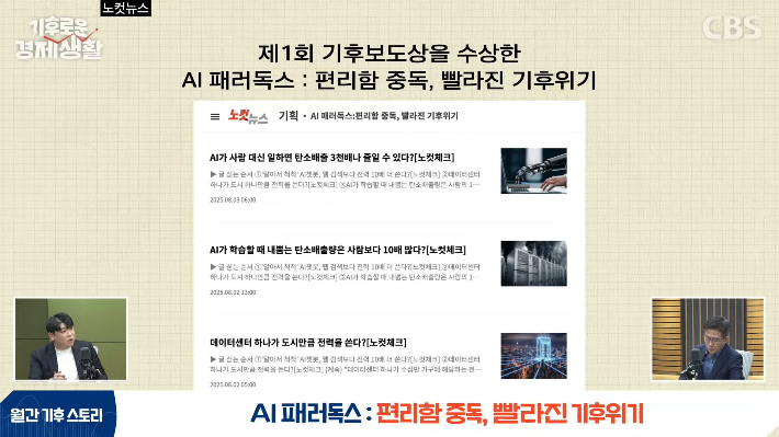 ◇ 강석찬> 박기묵 기자, 최원철 기자, 장윤우 기자, 그리고 저까지 총 4명이서 12건의 연속 기획 팩트 체크 보도를 했고요. 기후위기 관점에서 AI를 짚어보고자 했습니다. 막연히 AI가 기후에 악영향을 끼칠 수 있겠지, 정도의 의문점을 아 그렇구나, 로 바꾸는 과정이었다고 생각하시면 될 것 같습니다.