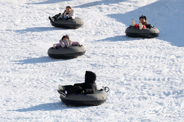 26일 서울 도봉구 성균관대학교 도봉선수촌 야구장에서 운영되는 눈썰매장을 찾은 어린이들이 즐거운 시간을 보내고 있다. 동시에 600명까지 입장할 수 있는 이 눈썰매장에는 각종 겨울철 즐길 거리가 마련된다. 길이 80m, 너비 15m, 높이 7m의 대형 슬라이드부터 미니 레일기차, 에어 범퍼카 등이 내년 2월 1일까지 운영된다. 입장료는 도봉구민은 무료, 타 구민은 2천원이다.