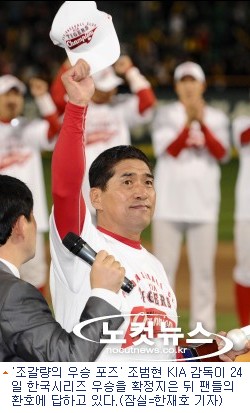 호랑이군단의 통산 10회, 개인 통산 첫 사령탑 우승을 이룬 조범현 KIA 감독(49). 충암고 시절 스승인 김성근 SK 감독(67)과 최종 7차전까지 가는 접전 끝에 마침내 대업을 이뤄냈다.