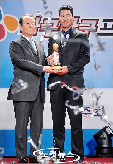 27일 오후 서울 잠실 롯데월드호텔에서 열린 2009 프로야구 최우수선수(MVP)와 최우수신인선수 및 부문별 시상식에서 타격 3관왕 타이틀과 함께 영예의 MVP에 등극한 김상현(KIA)이 KBO 유영구 총재와 함께 포즈를 취하고 있다.