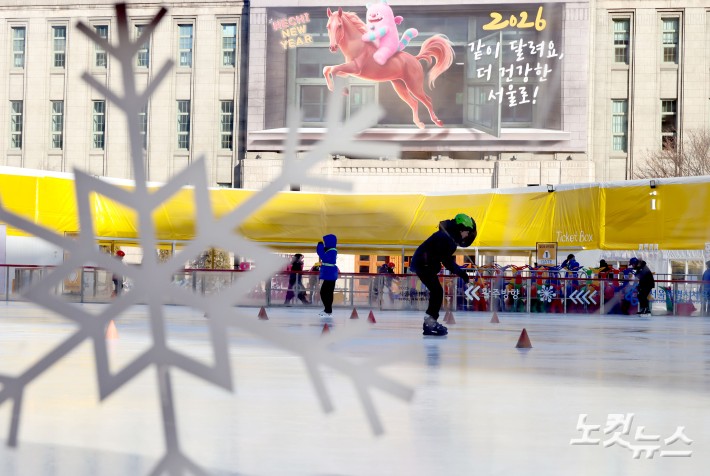 절기상 가장 춥다는 ‘대한’인 20일 서울 아침기온이 영하 11도까지 떨어지는 등 한파주의보가 내려진 가운데 서울광장 스케이트장에서 시민들이 스케이트를 타고 있다.